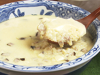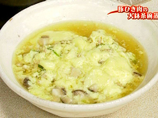 【だし汁について】 茶碗蒸しにはだし汁を使うことが多いが、この料理では豚ひき肉からうまみが出るので水でもおいしくできる。また、ひき肉と細かく切った野菜を炒めて使うため、卵液とのなじみがよく、普通の茶碗蒸しよりスが立ちにくくなり、失敗が少ない。 【蒸し方のアレンジ】 1人分の器で蒸す場合は、手軽な直蒸しでも作れる。直蒸しの場合は、鍋に器を直接入れ、器の高さの1/3まで熱湯を注ぎ、ふきんをはさんでふたをし、弱火で8~10分蒸す。