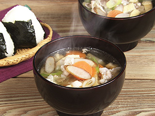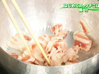 豚薄切り肉は、部位によってロース、もも、バラなどがあります。バラ肉は、三枚肉とも呼ばれ、脂身と赤身が層になった部分。うまみが多く出て、煮ても固くなりにくいので、豚汁にはバラ肉を使いましょう。ほかの具は家にあるものを好みで加えても。じゃが芋、里芋などの芋類や、たけのこ、こんにゃくなどでもOKです。