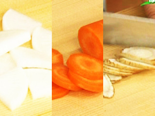 野菜は火の通りやすいものほど厚く、火の通りにくいものほど薄く切り、同時に煮えるようにする。また、ごぼうは皮に香りがあるので、皮をこそげずに、タワシでこすり洗いするだけにとどめる。