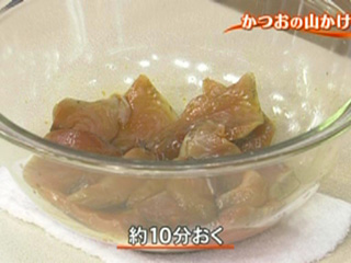 そぎ切りにしたかつおは、にんにく風味のたれに10分ほどからめておき、しっかりと味をつけるとおいしい丼になる。薬味はわさびよりにんにくが合う。