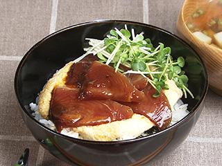 そぎ切りにしたかつおは、にんにく風味のたれに10分ほどからめておき、しっかりと味をつけるとおいしい丼になる。薬味はわさびよりにんにくが合う。