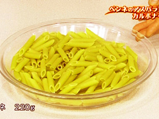 ペンネがゆで上がる3分前になったらアスパラガスを加えて一緒にゆでる。こうすると手間が省ける上、どちらもゆでたての熱々をソースであえることができる。