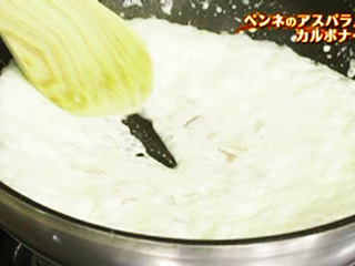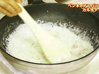 ペンネのゆで汁を加えてベーコンの塩気とうま味をひき出して、ソース全体の味になります。