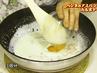 (3)ここからは手早く!パルメザンチーズを加えてから、卵黄を(ここで火にかかっていると卵黄に火が通りすぎてしまう)。