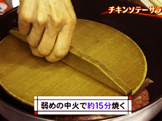 焼きはじめ10分くらいは鶏肉を落し蓋で押さえながら焼く。 途中、皮目から出てきた脂はペーパーで拭き取る。