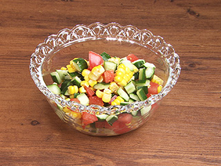 材料(4人分) きゅうり…2本 トマト…1個 とうもろこし…1本 キューピーノンオイル青じそ…適量 ●塩 作り方 (1)きゅうりは縦4つ割りにして種を除き、1cm幅に切る。トマトはヘタを除き、1.5cm角に切る。 (2)鍋にたっぷりの湯を沸かして塩少々を入れ、とうもろこしを入れて2分ゆでる。熱いうちにラップに包んで冷まし、ラップを外して包丁で実をこそげとる。 (3)ボウルに(1)、(2)を入れ、ノンオイル青じそをかけてあえる。