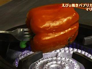 パプリカを直火焼きするときは、フォークは必ずヘタの部分に刺すのがコツ。やわらかい身の部分に刺すと、水分が出てしまいこんがり焼けない。