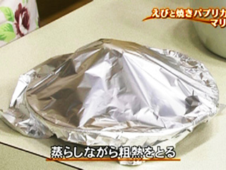 (2)焼けたものは冷めるまでアルミ箔をかぶせておく。(余熱が入り、むき易くなる)