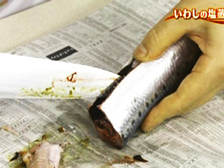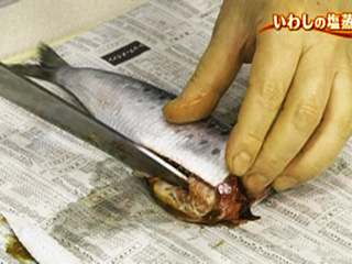 (2)腹側に三角に切り、腹ワタをとり出す。