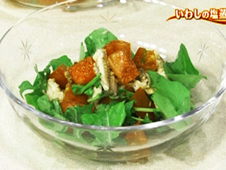 塩蒸ししたいわしは、ほぐしてトマト(1個)、ルッコラ(50g)、オリーブ油(適量)、しょうゆ(少々)、レモン汁(少々)と一緒にあえてサラダに。