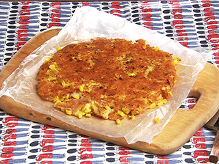 とうもろこしのチーズ焼きは、チーズがつなぎになっているので、全体に均等になるように広げること。