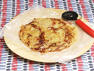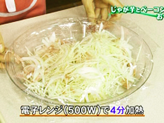 じゃが芋は野菜カッターを使って細切りにする。じゃが芋のでんぷんを利用するために水にさらさずに、また、すぐに電子レンジにかけるのがポイント。