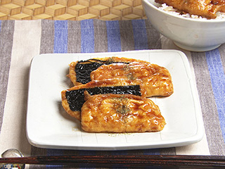 (1)のりの上に、豆腐だねを広げる(水でぬらしたスプーンを使い、平らにする)。