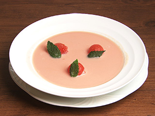 ピューレ状のスープに中に入っている食材をトッピングするのは、中身を知らせる役割もあります。