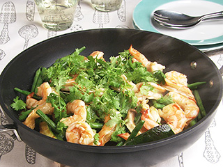 蒸しあがったらフライパンごとテーブルに出して、最後まで仕上げます。