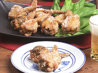 片栗粉は全体にまんべんなくまぶして、皮目を下にしてカラッと揚げます。