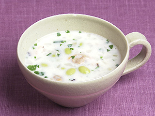 枝豆の代わりにセロリを、香菜の代わりにバジルやセルフィーユ、ハーブを使っても楽しめるスープです。