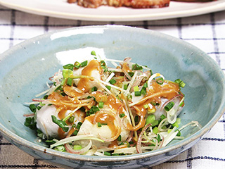 食べる直前に里芋、薬味野菜、たれを合わせます。