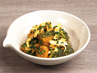 もう一品のあえものは、名残りのかぼちゃとはしりの春菊をからめた秋の出合いものです。