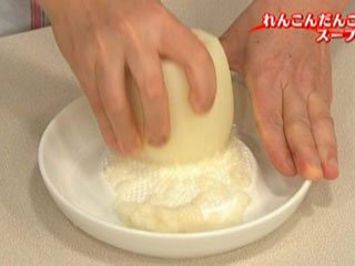 れんこんは皮をむいてすりおろし、汁ごと使う。汁にもでんぷん質が含まれているので無駄にしないこと。おろしたれんこんは火を通すと、でんぷん質の働きでモチモチの食感になる。