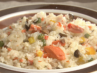 生臭みのないピラフに仕上げるために、塩鮭は皮を除き、熱湯をかけるのがポイント。