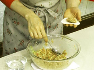 (1)具を等分にして、皮の真ん中に具をのせる。