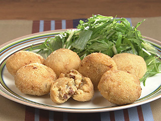 コロッケたねには小麦粉をしっかりまぶしてから、衣の小麦粉水をつけます。