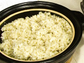 材料 玄米…2合 塩…ひとつまみ 作り方 (1)圧力鍋の場合と同様に玄米を洗い、2~2.5倍の水(約720~900ml)を加え、5~6時間浸水させる。 (2)鍋に(1)と塩を入れて強火にかける。沸騰したらふたをし、ふたから蒸気が吹き出すくらいの状態で1~2分強火のままにし、弱火にして40~45分炊く。火を止めて15分ほど蒸らし、ごはんの天地を返す。 ※鍋は鋳物などの厚手のものが、ムラなく熱がまわり、おいしく炊ける。