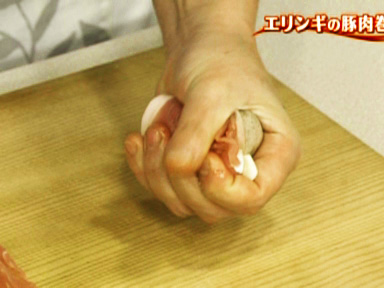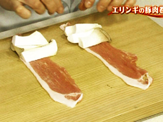 (1)豚肉を縦におき、エリンギ4~5本をのせる。