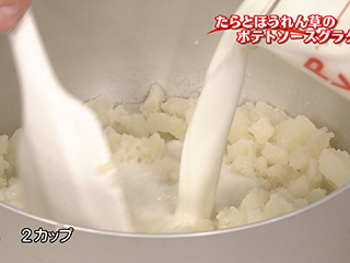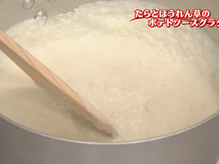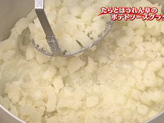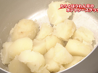じゃが芋はやわらかくゆで、湯を捨てて再び火にかけ、水分を飛ばして粉吹きにする。
