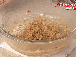 板粕は水を加えて電子レンジにかけてやわらかくし、泡立て器で混ぜてほぐしてから、みそを加えると混ざりやすい。