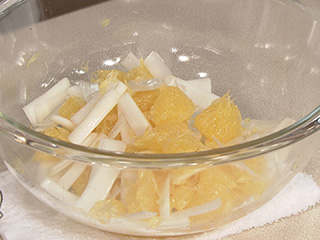 材料: 甘夏・・・1個 うど・・・1/2本(150g) 甘酢(酢小さじ2、砂糖小さじ1~1+1/2、塩小さじ1/4) 作り方 (1)うどは皮をむいて短冊切りにし、甘夏は薄皮を取り除き粗くほぐしておく。 (2)ボールに甘酢の調味料を混ぜ合わせ、(1)を加えてあえる。