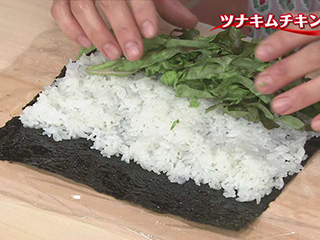 (4)葉っぱの上にツナ、キムチをのせる。
