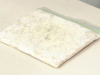 裂いた塩鶏は蒸し汁をからめた後、保存袋に入れ、薄く平たくして冷凍しておくと、使う分だけ折ってつかえて便利。