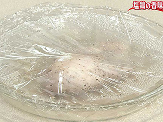 ラップをして電子レンジにかけた鶏肉は、そのままおいて冷ます。