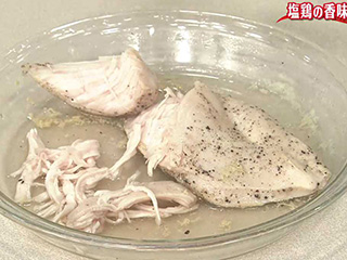 塩鶏は細かく裂いておくことがおいしさの秘訣、裂いたら必ず蒸し汁にからめてしっとりさせます。