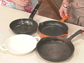 直火にかけられて、オーブン調理も可能な鋳物の鉄製フライパンがスキレット。ドイツ風パンケーキのほか、ハンバーグを直火で焼きつけてからオーブンで仕上げるなど、あると便利な調理道具。普通の鉄製フライパンも同様に使えるが、柄が長いものはオーブンに入らない場合がある。また、直火にかけられるグラタン皿があり、手頃な値段で手に入るので代わりに使ってもよい。