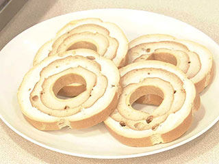 焼き麩の一種で新潟の名産品。生麩を太い金属の棒に巻きつけて筒状に焼き、乾燥させたもので、1~2cm幅に切って売られている。肉厚で歯ごたえがあり、味を含ませる煮ものに向く。