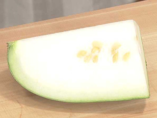 ウリ科の野菜。名前に反して7~9月が出盛り期。皮が厚く、切らずに丸のままなら冬まで保存できることから「冬瓜」の名前があるそう。95%が水分で低エネルギーだが、カリウムやビタミンC、B群を含む。完熟したものは皮の表面に白い粉のようなものが吹く。