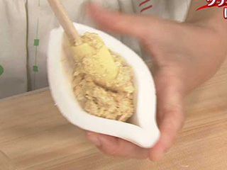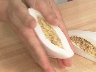 切り口に具を詰めたら両手ではさんでぴったり合わせる。空気が抜け、具がはんぺんになじむ。