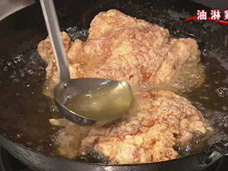 引っくり返して皮目を上にしたら、皮目に油をかけながら色づくまで揚げると、パリッとした揚げ上がりになる。