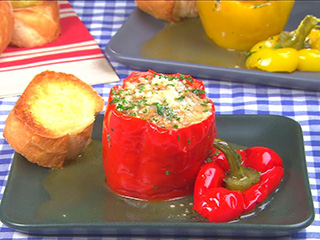 パプリカの表面全体を竹串でプツプツと刺しておくと、火の通りが良くなり、甘みが出る。
