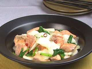生鮭は皮を除きながら厚めのそぎ切りにします。