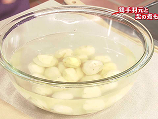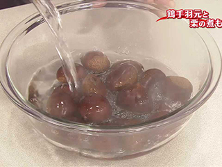 栗は洗って大きめのボウルに入れ、熱湯を栗がかぶるまで注ぎ、粗熱がとれるまでおく。
