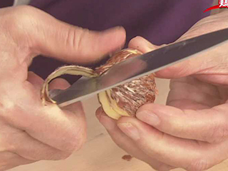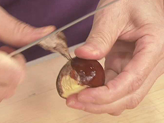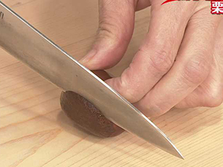 切り落としたところから包丁を引っかけて鬼皮をむく。