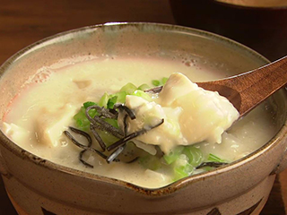 水に浸してやわらかくした大豆を水とともに砕き、煮沸してこしたもの。大豆たんぱくの含有量によって「豆乳」、「調整豆乳」、「豆乳飲料」があり、この料理には成分無調整の豆乳を使う。豆乳の栄養価は豆腐に準じ、低カロリーで良質のたんぱく質が豊富。