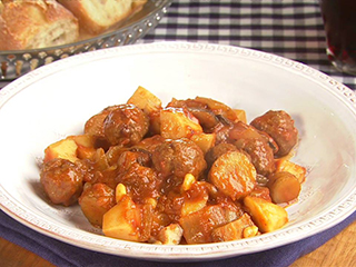 ミートボールを加えるときは、上面に並べてすぐにふたをし蒸し煮にして、水分が上がってきたら上下を返してさらに煮ます。