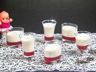 ラズベリーソースは先にグラスに流し入れて凍らせてから、パンナコッタを流し入れ冷蔵庫で冷やします。