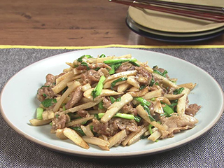 エリンギは豚肉と一緒に強火で炒めて、うま味を吸わせます。