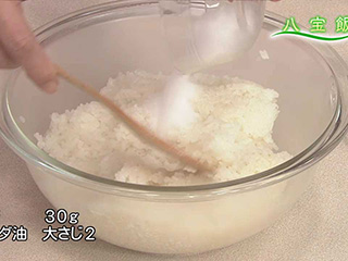 炊飯器で炊いたもち米は、ボウルにとり出し、熱いうちに砂糖とサラダ油を加えてよく混ぜる。